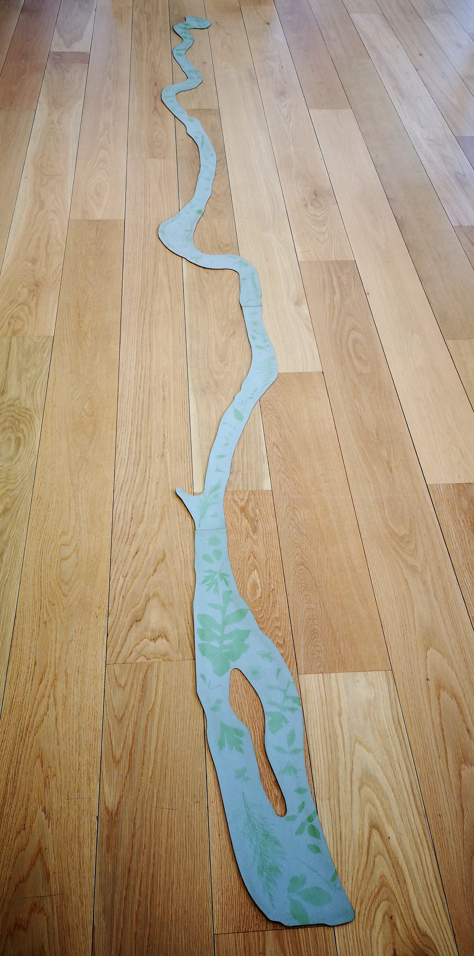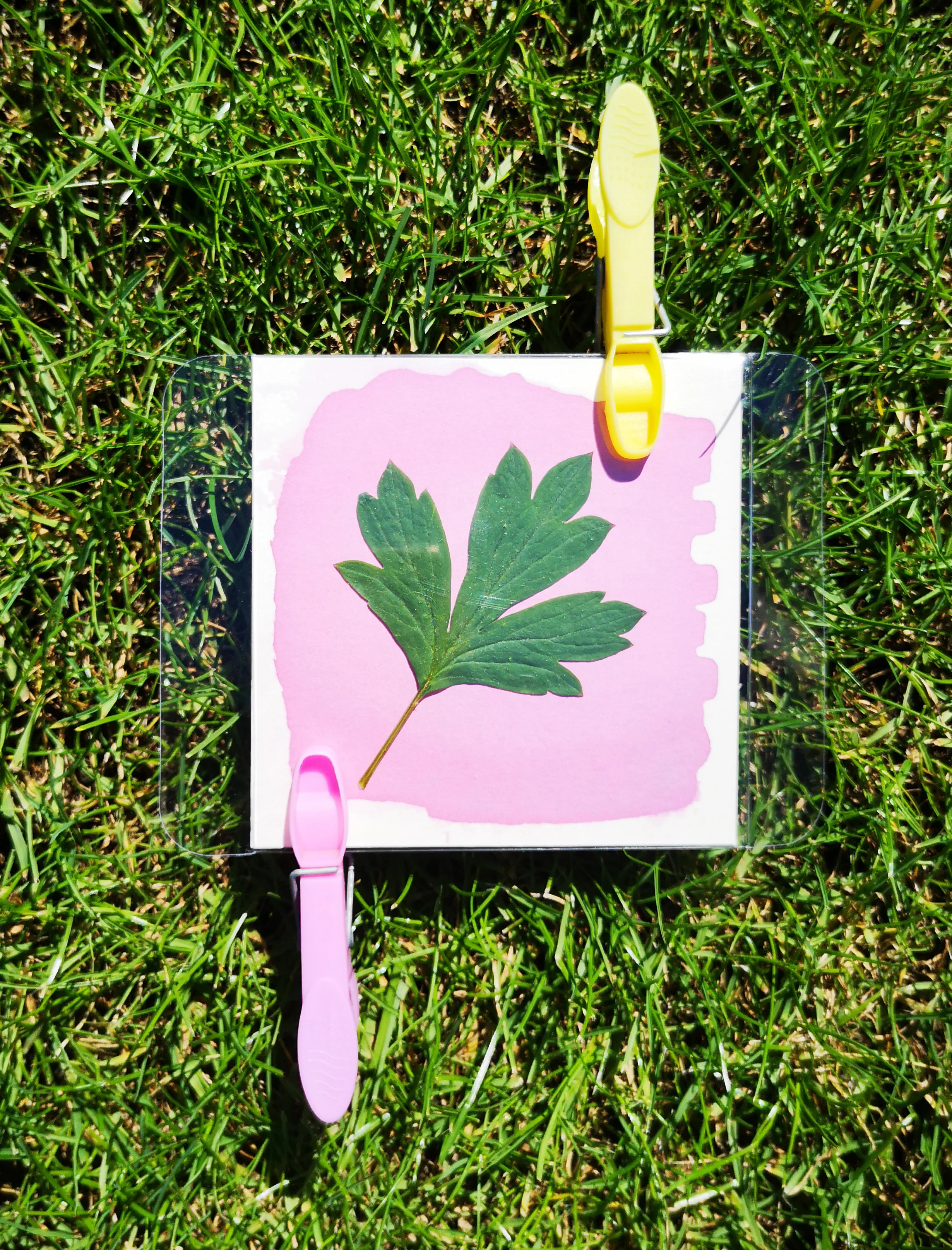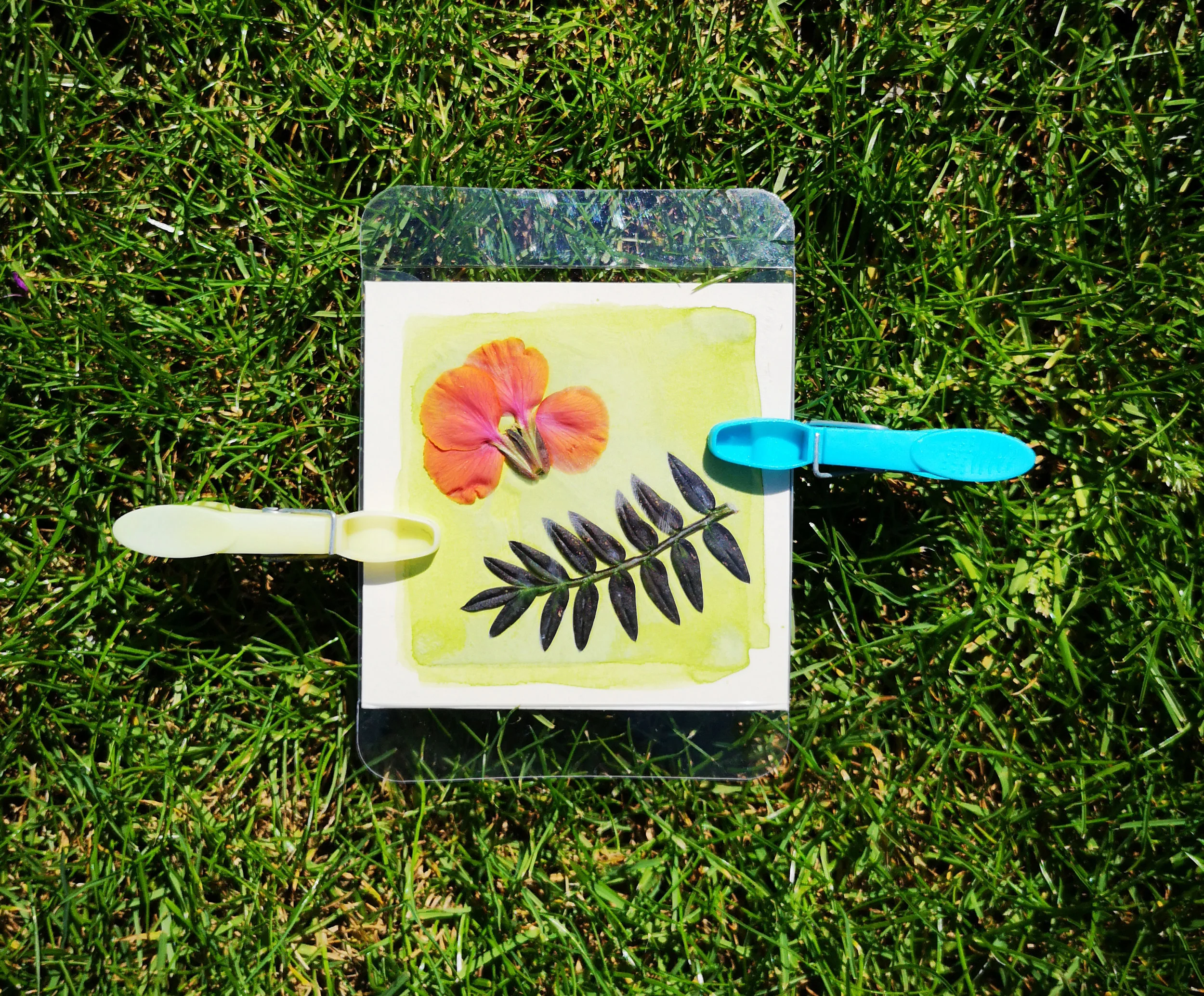 The pupils were asked to explore the surrounding area and collect small leaves, weeds and fallen petals of interest to compose their images. After exposing the foraged material to sunlight, a direct copy was left of those areas covered by shadow.